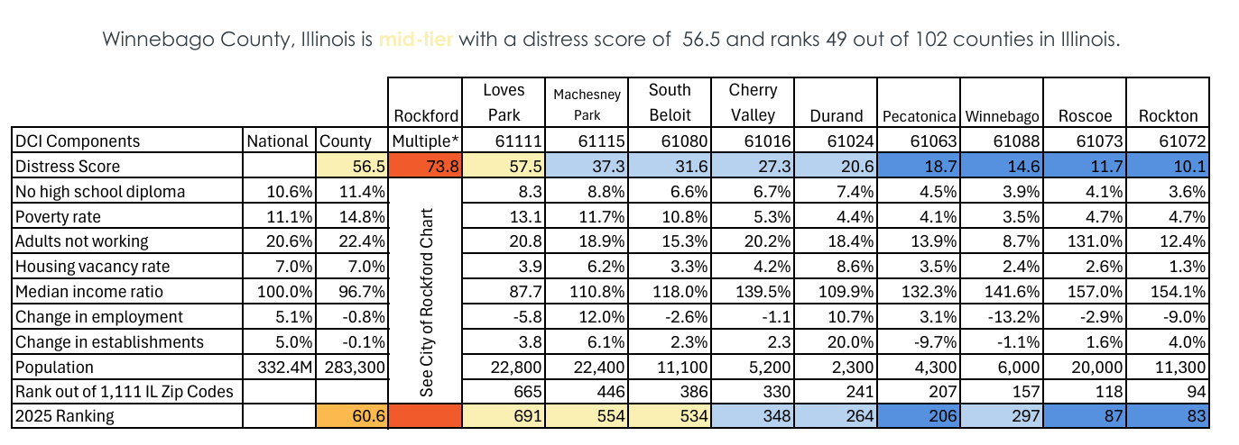 Running the data for each zip code in Winnebago County allowed us to see how it ranks on the Distressed Communities Index. Out of the 17 zip codes that comprise the County, four of them ranked as distressed, two are at risk, two are mid-tier, five are comfortable, and four are prosperous. The four zip codes that ranked as distressed made up 27% of the overall population, 20% are at-risk, 18% of the population are mid-tier, 20% are comfortable and 15% of the County’s population falls into the ranking of prosperous.