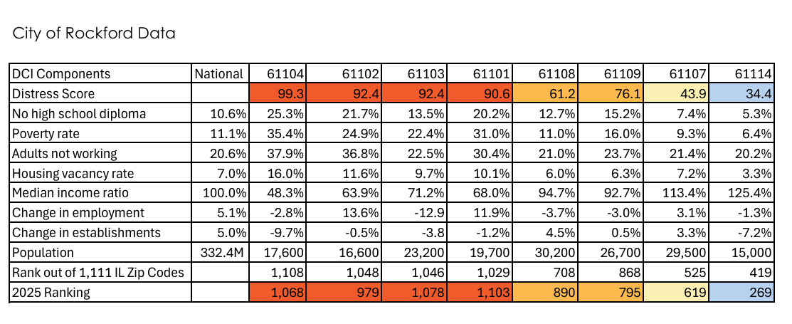 Running the data for each zip code in Rockford, Illinois, allowed us to see how it ranks on the Distressed Communities Index. Out of the eight zip codes that comprise the city, four of them ranked as distressed, two were at risk, one was mid-tier, and one was comfortable. None ranked as prosperous. The four zip codes that ranked as distressed made up 43% of the overall population, while just 8% of the city’s population fell into the ranking of comfortable.